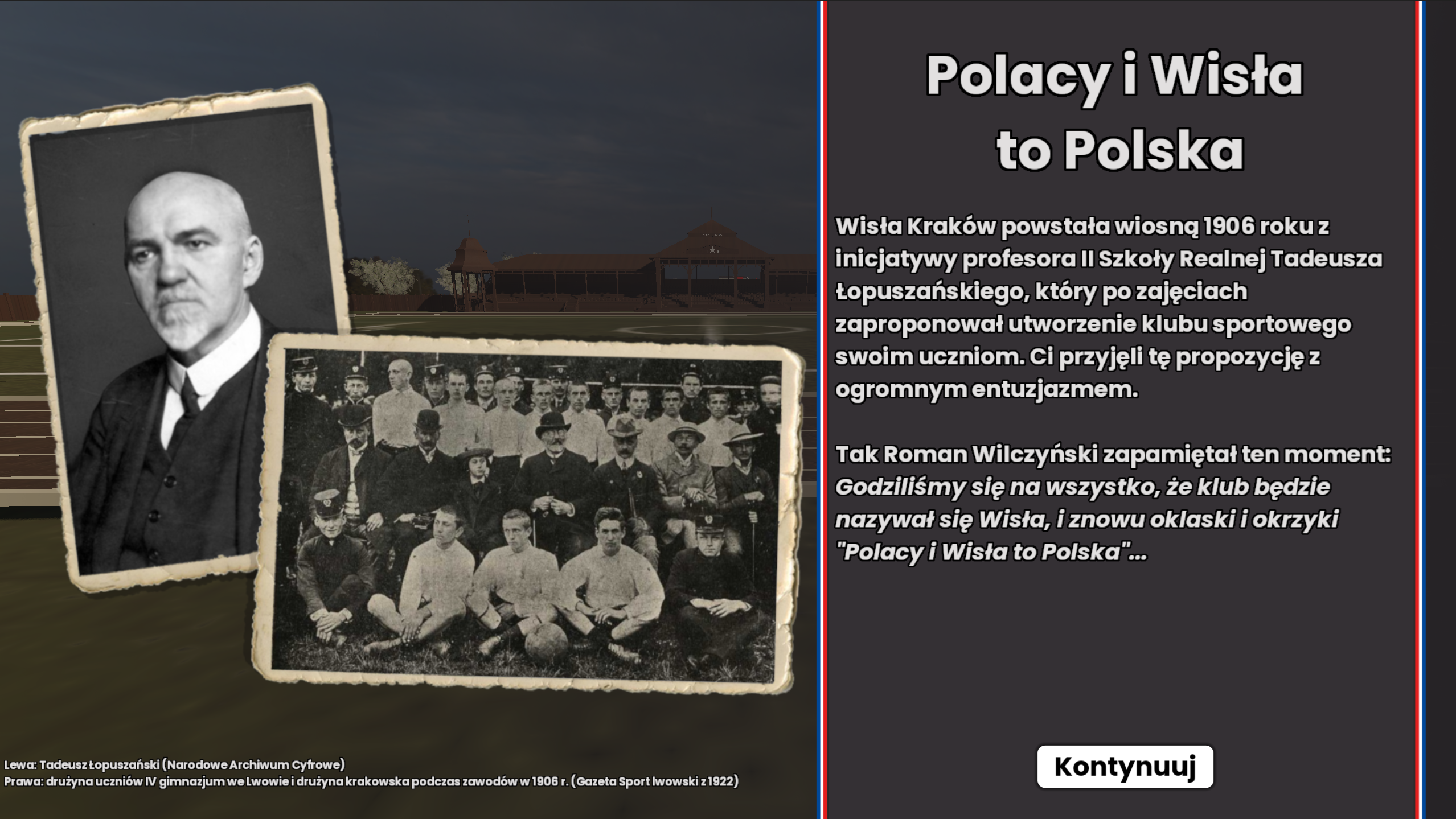 "Wiślacki Spacer" to wirtualna podróż po historycznych stadionach Wisły Kraków, gdzie będziesz mieć możliwość zapoznania się z najważniejszymi informacjami z historii tego klubu.